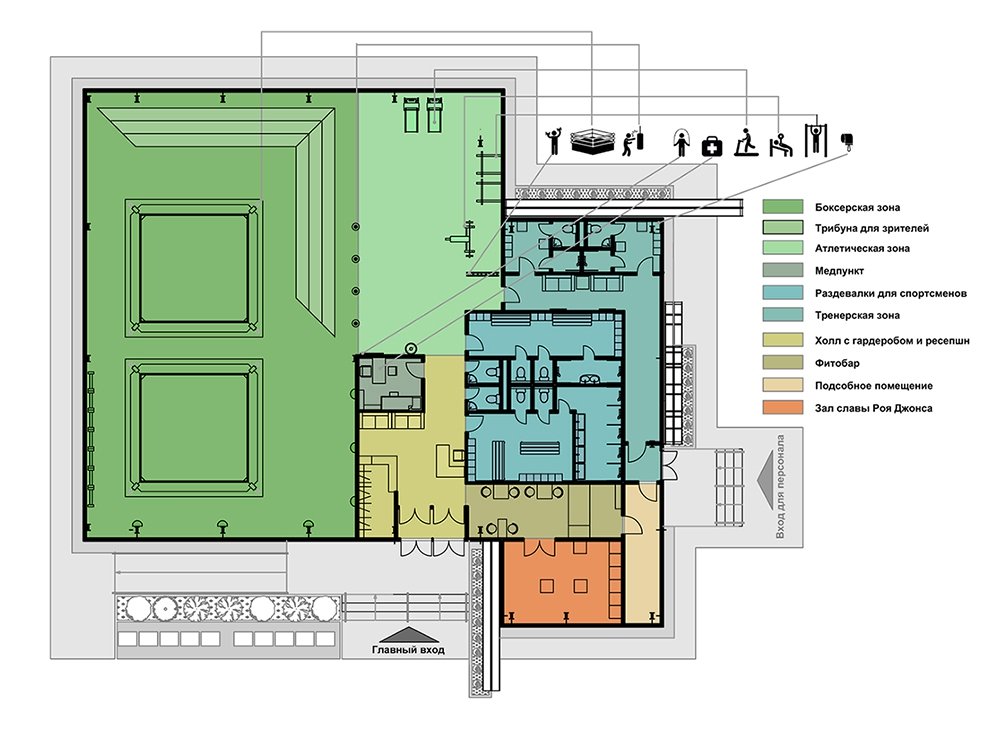 Обучение юных дарований будет проводиться преимущественно без оплаты, 70% детей смогут рассчитывать на бесплатное обучение в боксерской школе. Наиболее преуспевающие будут переведены в спецгруппу, в корпус в городе Одинцово, где ребята смогут готовиться к значимым соревнованиям. На территории застройки будет расположен личный особняк Роя Джонса с фермой, а также сауна и спа-комплекс восстановительной медицины.