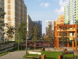 Яркие дома комплекса образуют аккуратный двор с игровыми комплексами и площадками для спортивных занятий.